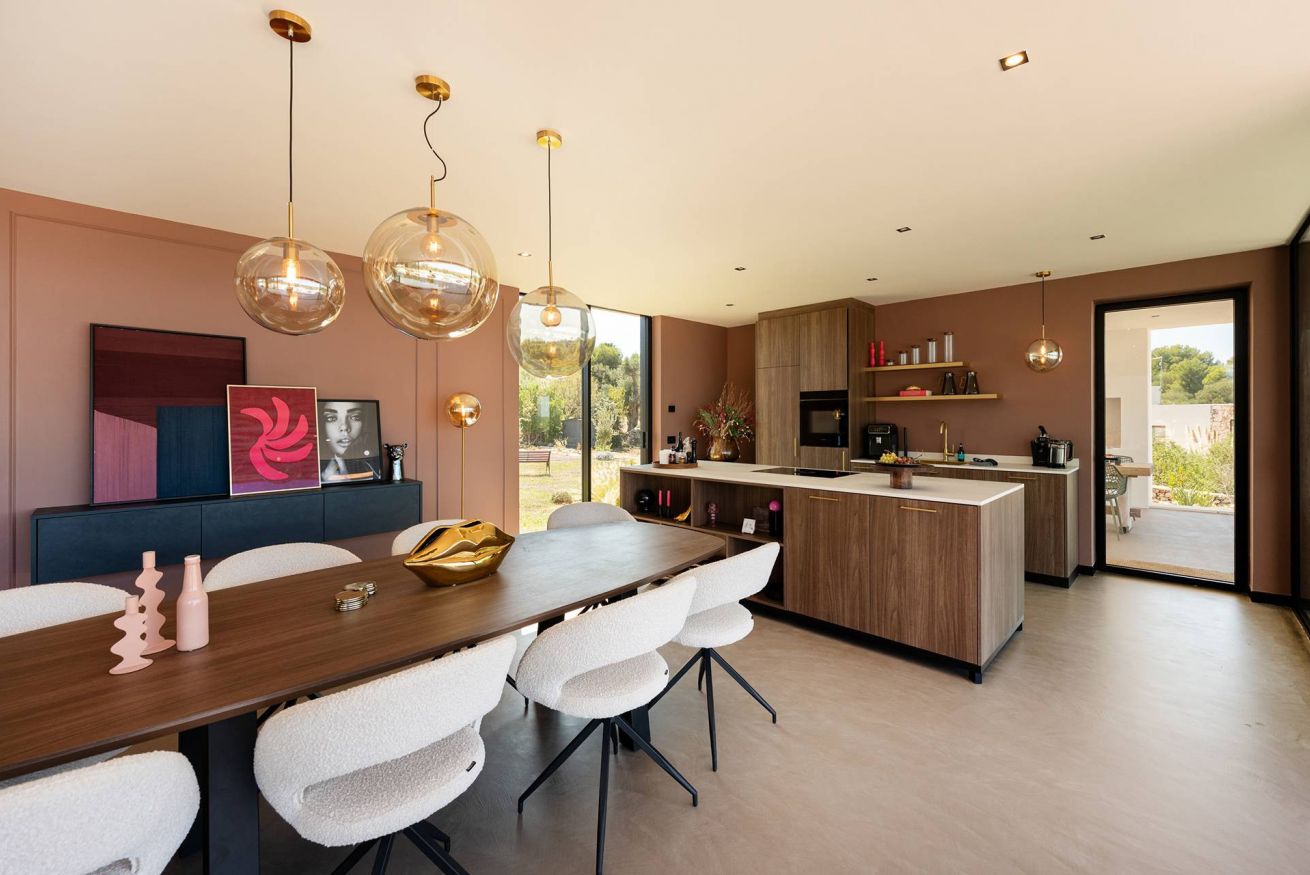 At the heart of the home, the open-plan living area combines elegance and comfort in perfect balance. A refined lounge, dining area, and fully equipped modern kitchen come together in a fluid design that invites both relaxation and conviviality.